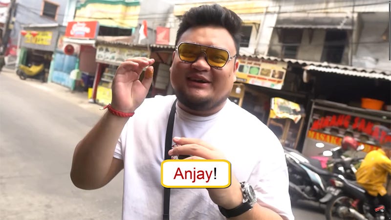 [Anjay] is actually the euphemism for the word [anjing], which is used to curse, but then the meaning of [anjay] has evolved, whereas nowadays, [anjay] is not used to curse.