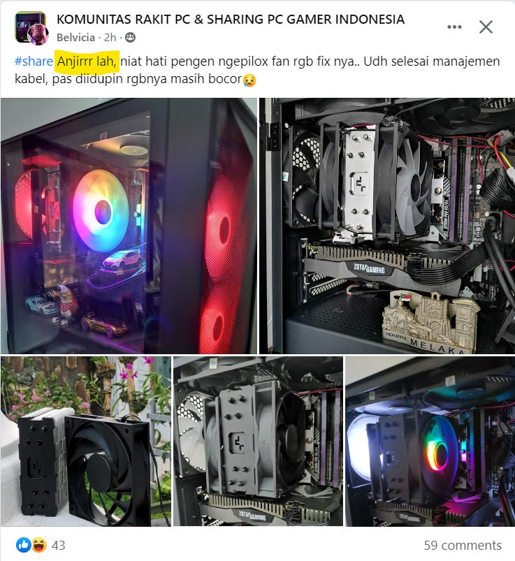 Here is an example I took from an Indonesian group that discusses computers. I found the word [anjir] being used there.