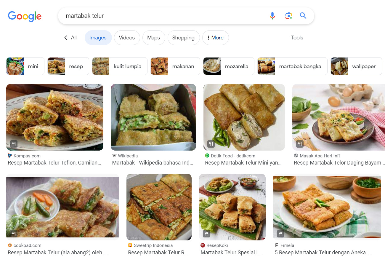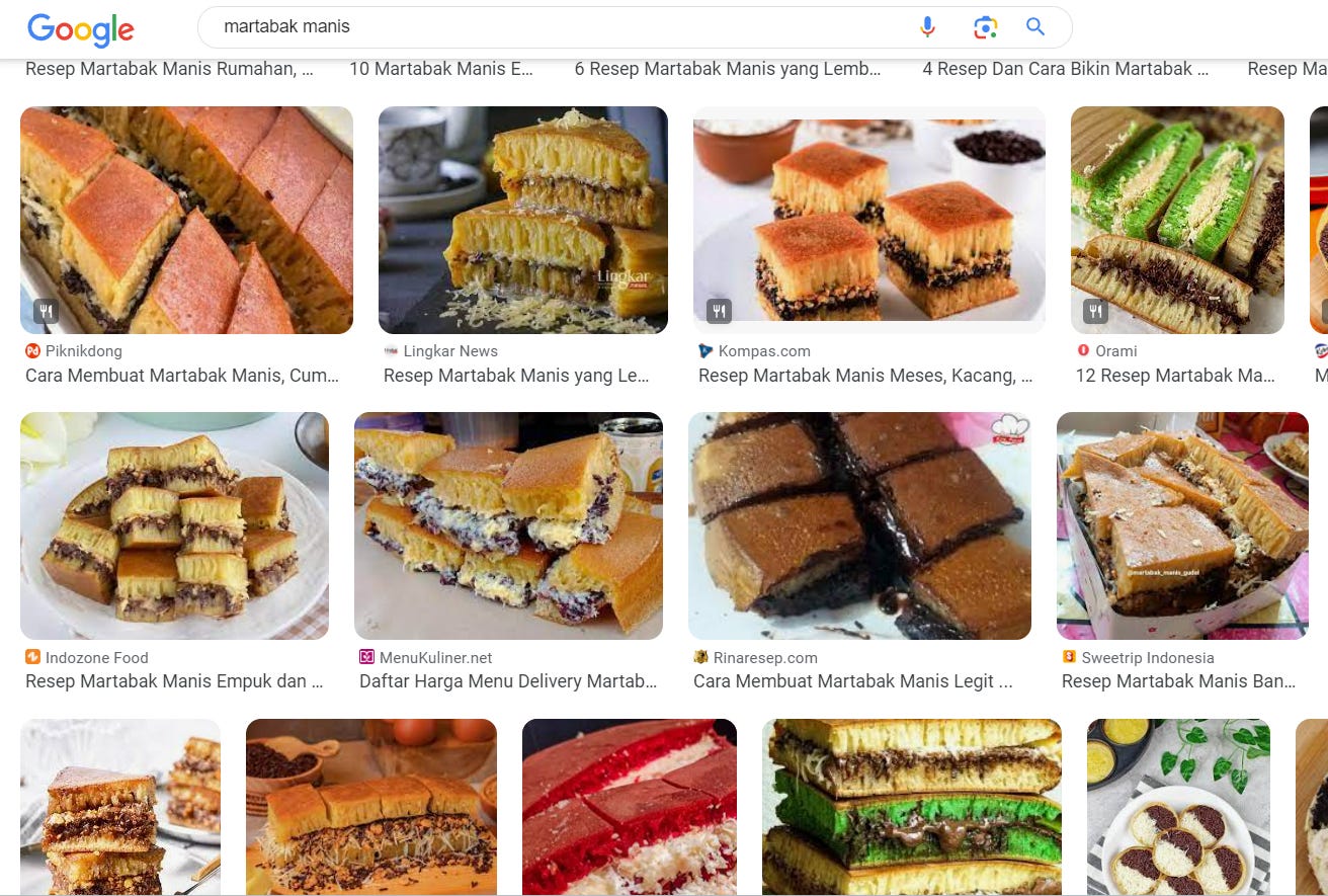 [Martabak] is one of the most popular street foods in Indonesia. Usually, in Indonesia, there are two kinds of martabak: martabak manis and martabak telur.