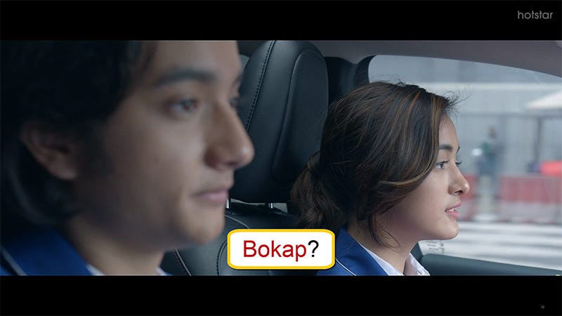This movie is set in Jakarta, so it’s normal for teenagers to use slang when they’re talking to their friends. Here, [bokap] means [father]. Alya uses the word [bokap] to refer to her dad.