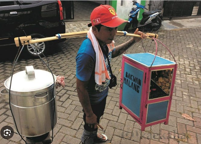 Tukang Sate: Keliling dulu. Jamannya pikulan dulu. (Yeah, he went around. Back in the day, he carried everything on a shoulder pole.)