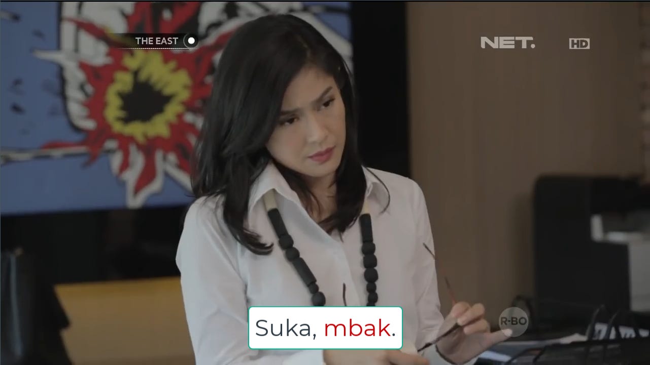 You’ll notice that Dhewo uses [mbak] when speaking to his boss. Even though Dian Sastro is actually much younger than him, she’s still his superior, so he uses this honorific to show respect.