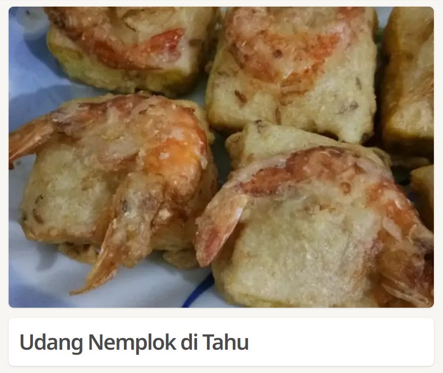 3. Udang nemplok di tahu. (The shrimp stick to the tofu.)