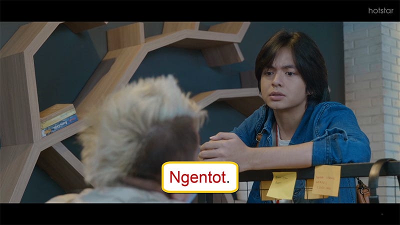 [Ngentot] in this clip refers to its literal meaning, which means to have sex with someone. In this clip, the word [ngentot] is not used as a curse word.
